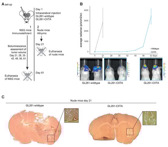 Fifty thousand GL261-wildtype or GL261-CIITA cells suspended in 2 μL phosphate-buffered saline (PBS, Gibco™, Grand Island, NY, USA) were injected in the right striatum of NSG (3 mice per group) and nude mice (5 mice per group) using a stereotactic frame (coordinates with respect to the bregma: ML −2.5, AP −1, DV −3) as described previously [].