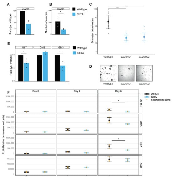 (A) Cell count assay of GL261 (murine) glioma cells in monoculture, Y-axis as ratio of GL261-CIITA versus GL261-WT. (B) Colony formation assay in GL261 cells, Y-axis depicting the number of colonies per condition (WT versus CIITA). All bargraphs represents mean with separate data points, * p < 0.05. (C) Boxplots representing mean ±SD and sepa-rate datapoints as size of individual spheres formed in a sphere formation assay, in grey GL261-WT cells, and in two tones of blue two clones (C1 and C2) of GL261-CIITA. *** p < 0.0001. (D) Representative images of the spheres from GL261-WT, -CIITA clone 1 and -CIITA clone 2. (E) Similar cell count assay as (A), but in human glioblastoma cell lines: U87, GM2 and GM3 * p < 0.05. (F) Boxplots representing mean ± SD with values representing relative luminescence units (RLU) * p < 0.05.