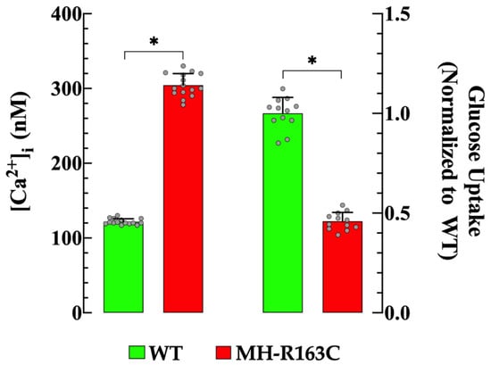 We have recently provided evidence that chronically elevated levels of [Ca2+]i decreased glucose uptake in isolated skeletal muscle [,]. We further explored this relationship by simultaneous measurements of the [Ca2+]i and insulin-dependent glucose uptake in MH-R163C hippocampal neurons. We confirmed a significant elevation in [Ca2+] I in the MH-R163C neurons compared with the WT neurons [] (Figure 1, left panel and Supplemental Figure S1). Furthermore, we revealed, for the first time, a significant decrease in insulin-mediated glucose uptake compared with the WT neurons (Figure 1, right panel, and Supplemental Figure S1). In the WT neurons, the hippocampal neuron [Ca2+]i was 122 ± 4 nM (n = 15), while in the MH-R163C neurons, it was 304 ± 15 nM (n = 15, p < 0.05 compared with the WT neurons). Furthermore, our investigation revealed a 2.6-fold decrease in insulin-stimulated glucose in the MH-R163C neurons compared with the WT neurons (p < 0.05 compared with the WT neurons) (Figure 1, right panel and Supplemental Figure S1).