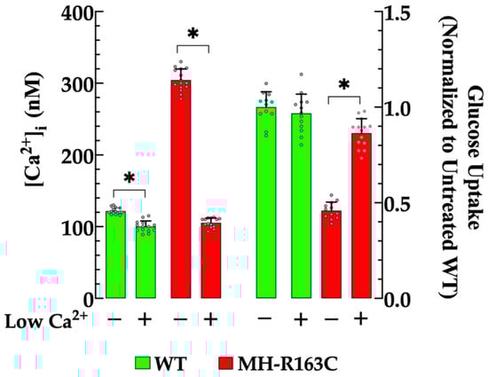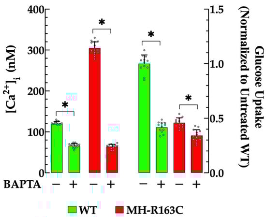 Subsequently, we investigated the effect of increasing the intracellular Ca2+ buffering capacity using the Ca2+ chelator BAPTA-AM [] on the [Ca2+]i and glucose uptake in the WT and MH-R163C hippocampal neurons. The treatment of the WT neurons with 10 µM BAPTA for 30 min resulted in a reduction in [Ca2+]i to 66 ± 4 nM (n = 13, p < 0.05 compared with the untreated WT neurons), while in the MH-R163C neurons, the [Ca2+]i decreased to 64 ± 6 nM (n = 15, p < 0.05 compared with the untreated MH-R163C neurons) (Figure 3, left panel). Notably, the glucose uptake was reduced 2.4-fold in the WT neurons (p < 0.05 compared with the untreated WT neurons) and 1.4-fold in the MH-R163C neurons (p < 0.05 compared with the untreated MH-R163C neurons) (Figure 3, right panel).