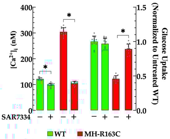 To further examine the relationship between the [Ca2+]i and insulin-stimulated glucose uptake, the WT and MH-R163C hippocampal neurons were treated with SAR7334, a specific blocker of TRPC3 and TRPC6 channels []. We have previously demonstrated the contributions of TRPC3 and 6 to elevated intracellular [Ca2+] in MH muscle at rest and during an episode of MH [,]. Incubation with 1 μM SAR7334 resulted in a significant reduction in the [Ca2+]i in both genotypes. Specifically, in the WT neurons, [Ca2+]i decreased to 99 ± 7 nM (n = 12, p < 0.05 compared with the untreated WT neurons), while in the MH-R163C neurons, it decreased to 105 ± 7 nM (n = 12, p < 0.05 compared with the untreated MH-R163C neurons) (Figure 4, left panel). Furthermore, the SAR7334 treatment led to a 1.9-fold increase in the glucose uptake in the MH-R163C neurons (p < 0.05 compared with the untreated MH-R163C neurons), while it did not significantly affect the glucose uptake in the WT neurons (p = 0.72) (Figure 4, right panel).