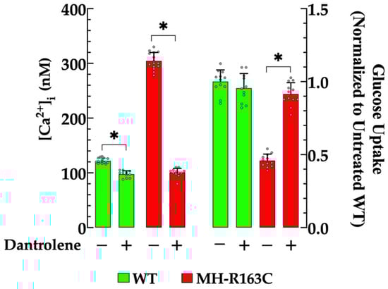 Dantrolene is a well-known agent used clinically to reduce spasticity or treat malignant hyperthermia in susceptible patients and experimental models [,,]. At the cellular level, it blocks Ca2+ leakage from the ryanodine receptor and mitigates the Ca2+ influx into excitable cells [,]. The incubation with 20 µM dantrolene resulted in a significant reduction in the neuronal [Ca2+]i in both genotypes and an increase in the glucose uptake in the MH-R163C neurons. Specifically, in the WT neurons, dantrolene decreased the [Ca2+]i to 98 ± 6 nM (n = 11, p < 0.05 compared with untreated WT neurons), while in the MH-R163C neurons, it decreased to 101 ± 8 nM (n = 12, p < 0.05 compared with the untreated MH-R163C neurons) (Figure 5, left panel). Furthermore, the dantrolene treatment significantly increased the glucose uptake 2-fold in MH-R163C neurons (p < 0.05 compared with untreated MH-R163C neurons), while it did not significantly affect the glucose uptake in the WT neurons (p = 0.55) (Figure 5, right panel). A higher concentration of dantrolene > 30 µM further reduced the [Ca2+]i and inhibited the insulin-dependent glucose uptake in both genotypes.