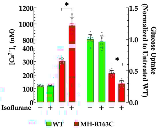 Our previous report demonstrated that isoflurane, a well-known trigger anesthetic for MH [], increased [Ca2+]i in cortical neurons in mice susceptible to MH []. We corroborated that isoflurane 1.5% further escalated the [Ca2+]i and found that it significantly exacerbated already impaired insulin-dependent glucose uptake in the MH-R163C neurons. Specifically, the [Ca2+]i was elevated to 980 ± 104 nM (n = 13, p < 0.05 compared with the untreated MH-R163C neurons) (Figure 6 left panel), and the glucose uptake was significantly reduced 1.5-fold (n = 13, p < 0.05 compared with the untreated MH-R163C neurons) (Figure 6 right panel). In contrast, the WT neurons exhibited no significant changes in either [Ca2+]i (122 ± 3 nM, n = 15, p = 0.99) or glucose uptake after exposure to isoflurane (n = 13, p = 0.58) (Figure 6 left and right panels, respectively).