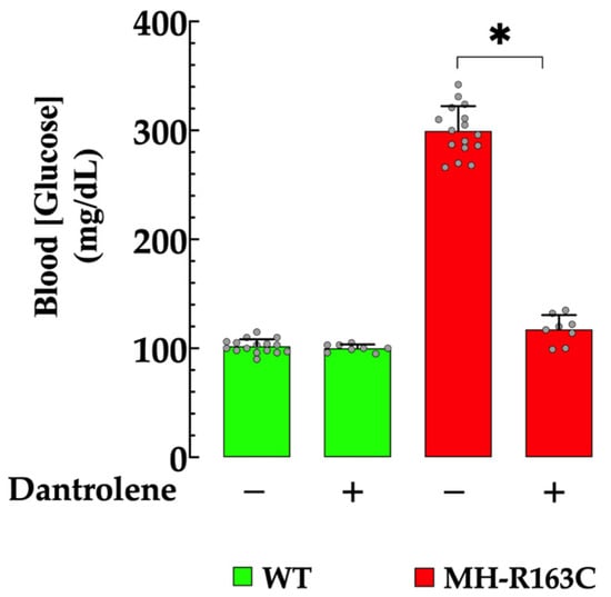 Dantrolene reduced the blood glucose levels in the MH-R163C mice. Values are expressed as the mean ± SD. The grey circles represent individual experimental values recorded under each condition. n = 8–16, nmice = 8. * denotes p < 0.05.