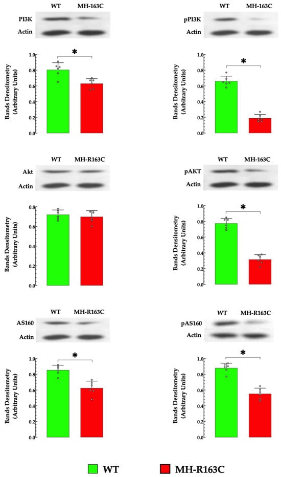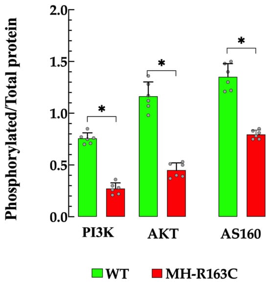 Another interesting finding was the alteration of the phosphorylated/total protein ratio in the PI3K/Akt and AS160 in the MH-R163C hippocampal neurons compared with the WT neurons. This ratio is a valuable biomarker that reflects the activation status of the insulin signaling pathway, which is crucial to regulating the glucose uptake in insulin-targeted cells. A decrease in the phosphorylated/total protein ratio, as observed in the MH-R163C neurons (Figure 9), indicates reduced pathway activation, which can alter the glucose uptake and contribute to insulin resistance. The impaired ability of neurons to respond to insulin not only disrupts the glucose metabolism but has also been linked with neurodegenerative conditions or cognitive impairments in T2D patients [,].