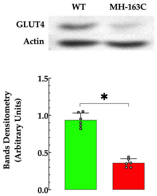 Three isoforms of the GLUT family (GLUT1, GLUT3, and GLUT4) have been detected in regions of the brain, including the basal forebrain; hippocampus; sensorimotor cortex; hypothalamus; and, to a lesser extent, the cerebral cortex and cerebellum []. Functionally, GLUT4 is involved in insulin-dependent glucose transport, which is predominantly expressed in insulin-sensitive tissues, such as skeletal muscle, adipose tissue, and the brain, more notably in the hippocampus []. In the present study, GLUT4 expression was significantly reduced in the MH-163C hippocampal neurons compared with the WT mice. The decrease in the GLUT4 expression is consistent with our previous findings in skeletal muscle from MH-R163C and db/db mice [], suggesting a possible connection to the observed decline in neuronal glucose uptake. While insulin resistance has traditionally been studied in metabolic tissues, such as muscle and adipose tissue, emerging evidence indicates that it also occurs in the brain [].