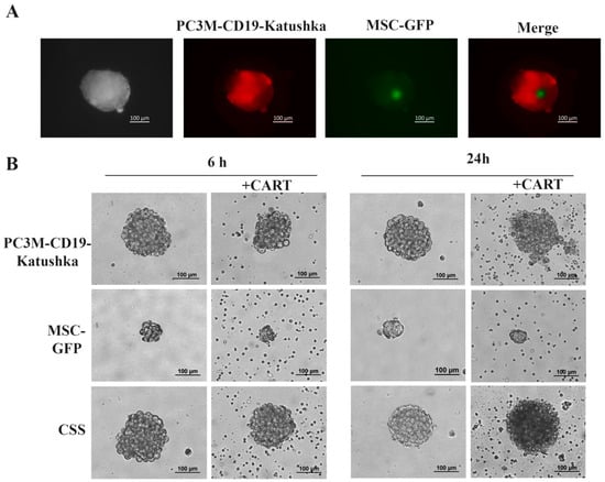 Microphotography of spheres formed by tumor, stroma cells, and their co-culture: (A) representative fluorescent microphotographs of CSS; (B) representative microphotographs of PC3M, MSC spheres, and CSSs treated by anti-CD19 CAR-T cells after 6 and 24 h of incubation.