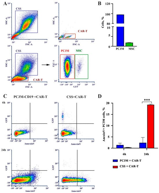 Analysis of cytotoxic effect of anti-CD19 CAR-T: (A) gating strategy to discriminate PC3M, MSC, and anti-CD19 CAR-T cells represented by flow cytometry plots; (B) proportion of PC3M and MSC in CSS; (C) representative flow cytometry plots with apoptotic cell gating strategy; (D) percent of Annexin V+ cells in PC3M spheres and CSS ( p-value is indicated as *** – ≤0.005). The data represents mean ± standard error of three independent experiments.
