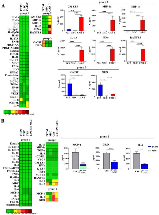 Analysis of cytokine and chemokine concentrations in the conditioned media: (A) analysis in the conditioned media of PC3M and MSC spheres, anti-CD19 CAR-T cell culture; (B) analysis in the conditioned media of PC3M and MSC spheres, and complex CSSs (p-values are indicated as **—≤0.01, ***—≤0.005, ****—≤0.0001).
