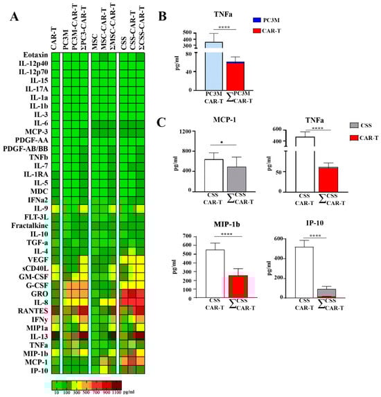Analysis of cytokine and chemokine concentrations in the conditioned media of spheres treated with anti-CD19 CAR-T cells for 6 h: (A) heatmap of cytokine and chemokine levels analyzed via multiplex immunoassay; (B) the TNFa level in the conditioned media of anti-CD19 CAR-T cell-treated PC3M spheres, and the arithmetic sum (Ʃ) of the cytokine amounts; (C) the MCP-1, TNFa, MIP-1b and IP-10 levels in the conditioned media of anti-CD19 CAR-T cell-treated CSSs and the arithmetic sum (Ʃ) of the cytokine amounts. *—≤0.05, ****—≤0.0001.