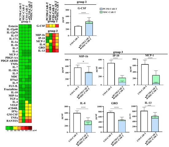G-CSF and GRO were detected in PC3M-conditioned media at significantly higher concentrations as compared to MSCs and anti-CD19 CAR-T conditioned media (Figure 3A, group 3).