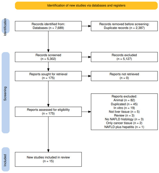 After removing duplicates, we included manuscripts according to the following inclusion criteria: (1) human studies in all languages; (2) observational or interventional studies where specific liver DNA methylation (l-DNAm) of 5-methylcytosine (5mC) was associated with MASLD and/or ALD (both targeted l-DNAm (methylation occurring within pre-selected DNA regions) and untargeted (methylation occurring in a large portion of DNA also known as genome-wide) studies were included); (3) outcomes involving liver steatosis with or without steatohepatitis and fibrosis attributed to MASLD or ALD where other liver diseases were excluded.