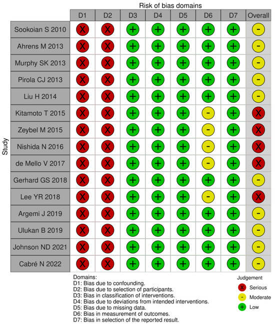 The level of heterogeneity was high and the bias analysis showed that the risk of bias was moderate to severe. Five articles were deemed to be at serious risk of bias, while the remaining ten had a moderate risk. Most articles did not employ methods to balance all the key characteristics between groups, leading to differences among them. Regarding BMI, some studies did not include normal-weight subjects. Furthermore, participants were initially recruited for studies with other primary objectives, and only later were their data analyzed for DNA methylation. Additionally, there is a challenge in measuring the type of alcohol consumed by patients.