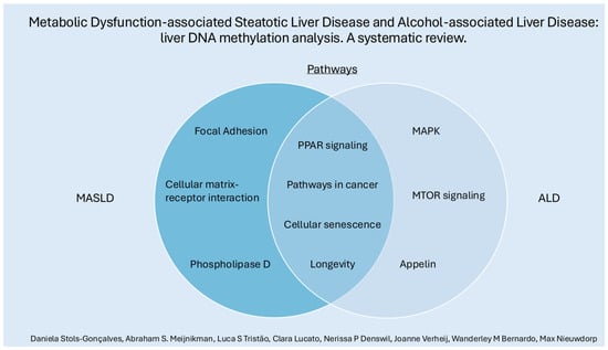This systematic review is the first that summarizes DNA methylation patterns and highlights the complexity of the epigenetic landscape in ALD and MASLD, underscoring how these patterns reflect not only the commonalities but also the unique pathways that distinguish these two conditions. While both diseases involve metabolic dysregulation and inflammation, their distinct DNA methylation profiles suggest that they engage different cellular processes and molecular networks.