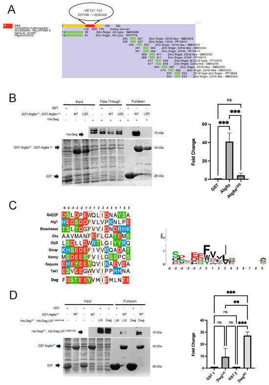 (A) Yeast two-hybrid data showing interaction of the Selected Interaction Domain fragment (SID) in yellow in the region between 1 and 180 of Dwg with Atg8a. Using the online iLIR software, an LIR motif with the sequence EEYVMI was identified within the SID region at position 127–132. (B) GST pull-down assay confirming interaction between Dwg and Atg8aWT and showing a reduced interaction between Dwg and Atg8aLDS mutant. Experiment was performed in triplicate and data were analyzed by one-way ANOVA with a post hoc Tukey test, *** p < 0.001, ns: not significant based on the statistical analysis performed. (C) LIR motif consensus sequences of known Drosophila LIR motif-containing proteins (LIRCPs). (Left panel) Alignment of the experimentally verified functional LIR motifs identified in Drosophila LIRCPs. The LIR peptide extends six amino acids N-term and nine amino acids C-term from the Atg8a LDS HP1-binding residue (designated as position “0”). Highlighted red dotted boxes denote the critical amino acids at positions “X0” and “X3” of the LIR core that dock to the HP1 and HP2 sites, respectively, within the Atg8a LDS pocket. Acidic amino acids are represented with red, basic amino acids with blue, and with green are serine and threonine residues that may be targets of de/phosphorylation cycles. (Right panel) Sequence logo map for the conservation of each residue with respect to its position in the extended LIR motif. Sequence logo graph constructed using WebLogo (available at: https://weblogo.berkeley.edu/). (D) GST pull-down assay looking at the interaction of Dwg with Atg8a when a mutation has been introduced in the predicted LIR motif responsible for the Atg8a binding. Alanine substitutions were introduced in the predicted binding sequence at positions 129 and 132 (EEYVMI EEAVMA). Data were analyzed by one-way ANOVA with a post hoc Tukey test, n = 3, *** p < 0.001, ** p < 0.01, ns: not significant based on the statistical analysis performed.