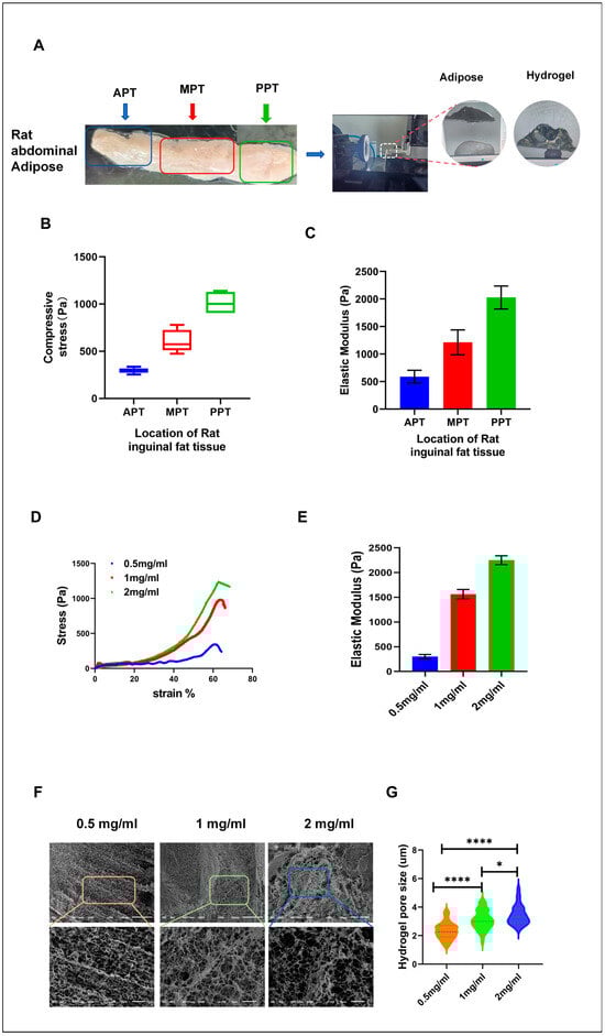 Mechanical properties of adipose tissue and physical characteristics of hydrogels at different concentrations. (A) Results of stress and elastic modulus tests on different regions of adipose tissue. (B) Statistical results of stress testing in adipose tissue. (C) Testing results of the elastic modulus in various regions of adipose tissue (n = 5). (D) Stress testing results of hydrogels at different concentrations. (E) Elastic modulus testing results of hydrogels at varying concentrations (n = 5). (F) SEM images of hydrogels at different concentrations. (G) Statistical analysis of pore sizes in hydrogels at different concentrations (n = 80). The pore diameters were analyzed using Nano Measurer 1.2 software and statistically processed using GraphPad Prism 8.0.2 software.* p < 0.05. **** p < 0.0001.