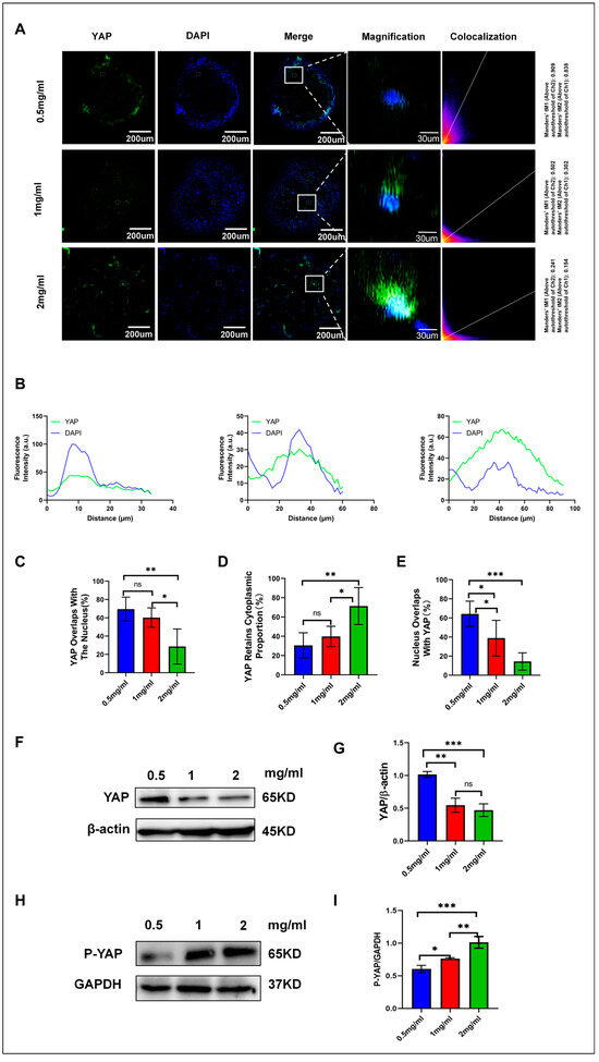 Immunofluorescence co-localization and protein analysis of YAP expression in hydrogels. (A) Immunofluorescence staining of YAP in adipocytes cultured in hydrogels of different concentrations. YAP is shown in green, and the nucleus is stained with DAPI (blue), with the merged images displaying co-localization. In the histogram, the red represents YAP signals (green fluorescence channel), while the blue represents DAPI signals (nuclei). (B) A single cell is outlined as the test subject, as shown in (A). The nucleus is labeled in blue and YAP is labeled in green, outlined by a white line. The fluorescence intensity distribution of YAP and DAPI along the white box is analyzed, with the intensity values normalized to the average YAP intensity. (C) Percentage of YAP co-localized with the nucleus. (D) Proportion of YAP signals not overlapping with the nucleus. (E) Percentage of YAP localized within the nucleus. (F) Western blot analysis of YAP protein expression in varying hydrogel concentrations. (G) Quantitative analysis of YAP protein expression across varying hydrogel concentrations. (H) Western blot analysis of phosphorylated YAP (P-YAP) protein expression in hydrogels of different concentrations. (I) Quantitative analysis of P-YAP protein expression across various hydrogel concentrations was conducted. Fluorescence intensity and co-localization data were processed with ImageJ 1.52P software, and statistical analysis was executed using GraphPad Prism 8.0.2 software. Statistical significance is indicated as * p < 0.05. ** p < 0.01, *** p < 0.001, and ns for not significant (n = 3).