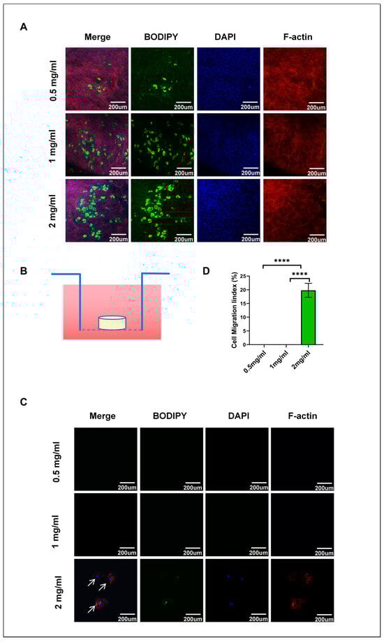 The larger pores in the 2 mg/mL hydrogel, ranging from 2.5 to 5 µm, facilitate greater nutrient exchange between the cells and their environment, while also providing sufficient space for cell migration and growth. Similarly, such large pores enhance the capability of mechanical sensing of cells within the matrix, thereby improving cell–hydrogel interactions. The previous literature has demonstrated that cells can modulate their differentiation processes by sensing the mechanical properties and pore structure of the matrix [19,24]. Larger pores in the 2 mg/mL hydrogel may create a more favorable microenvironment for differentiation. In comparison to the lower concentration hydrogels (0.5 and 1 mg/mL), the 2 mg/mL hydrogel exhibits higher compressive stress and elastic modulus, along with a larger pore structure, which may enhance nutrient uptake and facilitate the reception of differentiation signals. This suggests that pore size is related to cell differentiation, providing 2 mg/mL hydrogels with a distinct advantage in promoting adipocyte differentiation.