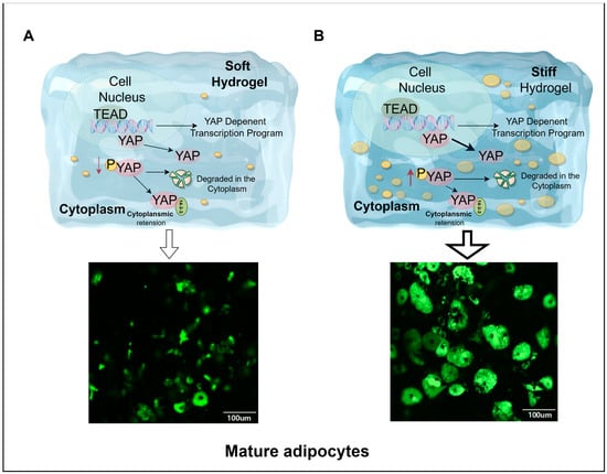 Adipocyte differentiation is regulated by the YAP signaling pathway. (A,B) show collagen hydrogels of different stiffness. In softer hydrogels (A), the translocation of YAP from the nucleus to the cytoplasm is diminished, along with reduced phosphorylation, resulting in decreased lipid droplet accumulation. In contrast, in stiffer hydrogels (B), YAP translocates more readily from the cytoplasm to the nucleus, accompanied by elevated phosphorylation, which enhances lipid droplet accumulation. Hydrogels with varying matrix stiffness influence YAP’s relocalization between the nucleus and cytoplasm under mechanical stress. When YAP remains in the cytoplasm, it undergoes phosphorylation, promoting the initiation of the adipocyte differentiation program. Therefore, matrix stiffness ultimately affects adipocyte differentiation by regulating both the cellular localization and activity state of YAP. This figure was created with Figdraw (HOME for Researchers).