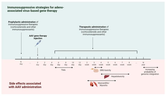 Timeline of immune-mediated adverse events and immunosuppressive strategies for AAV-based gene therapy. The earliest immune-mediated side effect caused by AAV injection is thrombotic microangiopathy (TMA), which occurs 5–10 days after treatment. Starting from the second week, there is a risk of developing side effects such as hepatotoxicity, myocarditis, myositis, and dorsal root ganglia (DRG) toxicity. In order to reduce the risk of developing immune-mediated side effects, immunosuppressive therapy is used. The administration of immunosuppressive drugs is possible in two modes—prophylactic administration (carried out before AAV gene therapy) and therapeutic administration (carried out in response to the appearance of immune-mediated side effects).