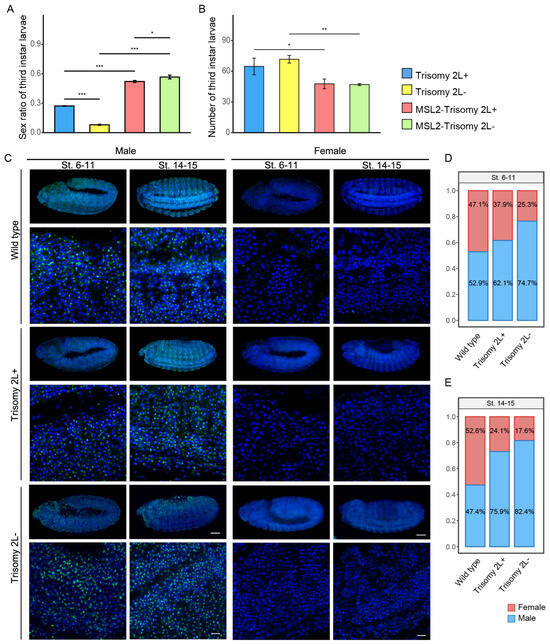 A previous study showed that H4K16ac was more enriched in male embryos than in female embryos [38]. Therefore, the sex ratios of the embryos were analyzed based on varying levels of H4K16Ac from immunolocalization (Figure 1C and Figure S4). At Stages 6–11 and 14–15 of embryonic development, sex ratios in diploidy were consistently close to 0.5 (Figure 1D,E). In both instances of trisomy 2L, sex ratios decreased as the embryos developed, gradually approaching levels observed in the third instar larvae (Figure 1A,D,E). Sex ratios were lower in trisomy 2L- than in 2L+ during these embryonic developmental stages. These results indicate that the sex ratio in trisomy 2L decreased during embryonic development, suggesting a continuous change. Differences in sex ratios between trisomy 2L- and 2L+ persisted across the embryonic developmental stages.