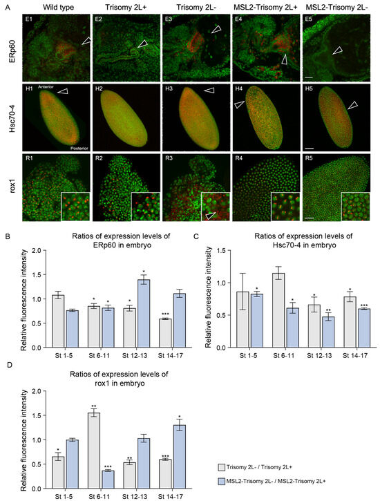 Transcript localization and relative fluorescence intensity of ERp60, Hsc70-4, and roX1. (A) Changes in transcript localization of ERp60, Hsc70-4, and roX1 RNA in wild type, trisomy 2L+, trisomy 2L-, MSL2-trisomy 2L+, and MSL2-trisomy 2L-. The genotype of the sample is shown above, and the type of RNA probe is shown on the left. Green is the DNA signal, and red is the RNA probe signal. The arrowheads in E1–E5 present the location of the foregut. E1–E5, Stages 14–17; H1–H5, Stage 5; R1–R5, Stages 6–11. Scale bars, ERp60 and rox1, 30 μm; Hsc70-4, 80 μm. (B–D) The ratios of ERp60 (B), Hsc70-4 (C), and rox1 (D) expression levels of trisomy 2L- to trisomy 2L+ and MSL2-trisomy 2L- to MSL2-trisomy 2L+. The relative fluorescence intensity was calculated as the ratio of the RNA signal to the DAPI signal. Error bars indicate mean ± S.D. The one-sample Wilcoxon test was used to analyze statistical variance and the hypothesis value was set to 1. * p < 0.05; ** p < 0.01; *** p < 0.001; non-significant results are omitted.