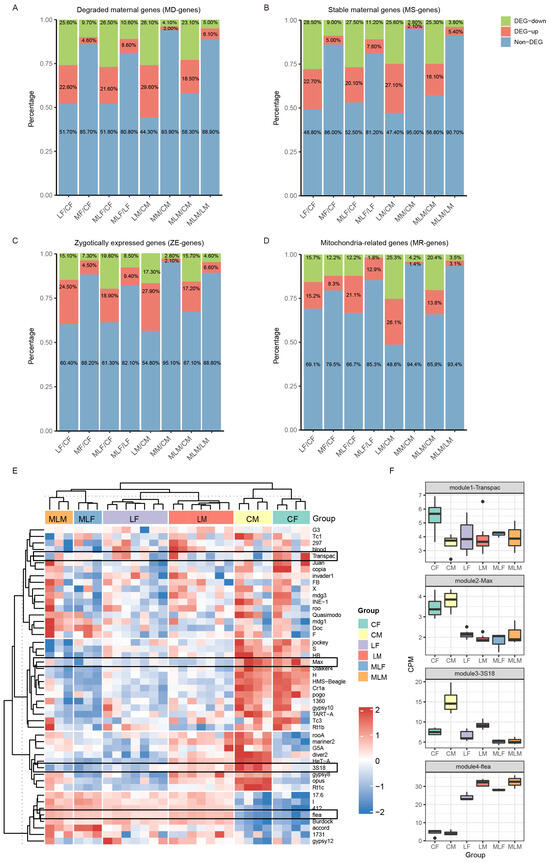 The expression levels of genes and TEs in aneuploidy. (A–D) The proportion of three modes of gene alterations: upregulated genes (red), downregulated (green), and non-significantly differential genes (blue). The numbers of the three gene types are 2637, 2118, and 820, respectively and they include (A) degraded maternal genes (MD-genes), (B) stable maternal genes (MS-genes), (C) zygotically expressed genes (ZE-genes), and (D) mitochondria-related genes (MR-genes). The samples are shown, including trisomy 2L and wild type (LF vs. CF), over-expressed MSL2 and wild type (MF vs. CF), MSL2-trisomy 2L and wild type (MLF vs. CF), MSL2-trisomy 2L and trisomy 2L (MLF vs. LF), trisomy 2L and wild type (LM vs. CM), over-expressed MSL2 and wild type (MLM vs. CM), MSL2-trisomy 2L and wild type (MLM vs. CM), and MSL2-trisomy 2L and trisomy 2L (MLM vs. LM). The percentages are shown on the left. (E,F) Differential expression of (TE) families of aneuploidy compared to diploidy. (E) Heatmap showing the expression levels of TEs in the groups. CF, wild type female; CM, wild type male; LF, trisomy 2L female; LM, trisomy 2L male; MLF, MSL2-trisomy 2L female; and MLM, MSL2-trisomy 2L male. Each column is a biological replicate and each row is a TE family. Hierarchical clustering is carried out only within the TE family with CPM greater than 2. K-means clustering is used to divide selected TE families into four modules separated by horizontal lines. (F) The expression of the selected TE families from four modules. The middle lines in the boxplots indicate the medians. Whiskers are the line segments from the box boundary to the maximum and minimum non-outliers. Black dots indicate outliers that lie outside of the whisker.
