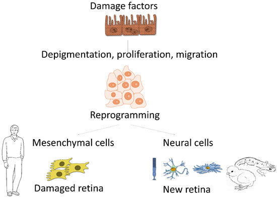 Mammalian and human RPE cells are of great interest as sources of new photoreceptors and other neurons in the degenerating retina, taking into account their anatomical, genetic, and epigenetic characteristics, origin, evolutionary heritage, and ability to dedifferentiate, proliferate, and be flexible [16].