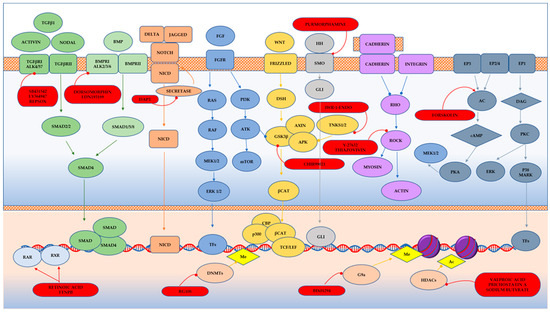 Molecules that suppress the original characteristics of the cells. For example, if the original cell has a mesenchymal phenotype, it is necessary to induce MET in it. For this purpose, an inhibitor of Wnt and TGF signaling pathways, an inhibitor of GSK3β CHIR99021 is usually used. It has been shown that inhibition of four signaling pathways by small molecules Notch, TGF-β, BMP, and GSK-3β is sufficient for efficient reprogramming of human fetal glial cells into neurons in vitro and for activation of neurogenesis in the mouse hippocampus in vivo [50]. Zhang et al. used LDN193189, SB431542, and TTNPB to inhibit glial signaling pathways and activate neuronal signaling pathways and thiazovivin (Tzv) to improve reprogramming efficiency and cell survival [38,72]. When differentiating ESCs and iPSCs into RPE cells, most protocols initially involve inhibition of TGF-β and Wnt signaling pathways by small molecules, followed by their activation [73].