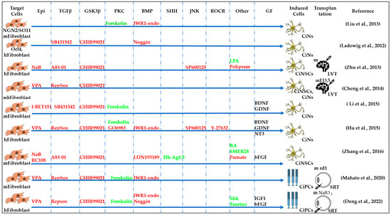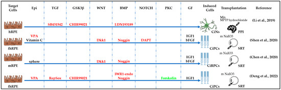 Compounds that induce development of the characteristics of the resulting cells. Small molecules used to reprogram cells into CiPSCs, CiNSCs, and CiNs activate the Wnt signaling pathway and inhibit TGF-β and BMP signals. The Wnt signal is known to stimulate neurogenesis, and inhibition of TGF-β and BMP signals induces differentiation of pluripotent cells [72]. For the induction of neurons, compounds are required that will promote the specialization and maturation of neurons, such as ISX9 and Dorsomorphin [12,37,43]. For reprogramming astrocytes into neurons, CHIR99021 and DAPT were used to induce CiNs, followed by treating the cells with smoothened agonist and purmorphamine to activate the Sonic Hedgehog signaling pathway, which is the main factor in neural patterning [38]. The presence of forskolin, noggin, retinoic acid, and a number of growth factors important for neurogenesis (bFGF and IGF) is required for successful and effective reprogramming of RPE cells into neural retinal cells.