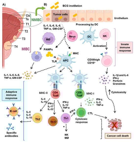 Immunological mechanisms of intravesical BCG treatment in bladder cancer: (A) Classification of BC according to the TNM staging system. CIS (carcinoma in situ) represents a non-muscle invasive bladder cancer (NMIBC) confined to the bladder lining; Ta, papillary NMIBC limited to the inner lining; T1, NMIBC that invades the subepithelial connective tissue without penetrating the muscle layer; T2, muscle-invasive bladder (MIBC) cancer; T3, MIBC that invades the perivesical tissue surrounding the bladder; and T4, advanced MIBC that invades surrounding structures such as the prostate, uterus, or pelvic wall. (B) NMIBC is treated with BCG. Upon instillation, BCG is taken up by bladder urothelial cells, antigen-presenting cells (APC), macrophages, and dendritic cells (DCs), leading to the release of pro-inflammatory cytokines and the activation of the immune response, including T and natural killer (NK) cells, which recognize and attack tumor cells. DCs express toll-like receptors (TLRs) that recognize pathogen-associated molecular patterns (PAMPs), promoting the secretion of cytokines and the presentation of tumor antigens via the major histocompatibility complex (MHC) to CD4+ and CD8+ T lymphocytes, thus contributing to tumor eradication. BCG induces NK cell functional maturation, increasing the expression of CD56 and the release of proinflamatory cytokines, granzyme, and perforin, which contribute to the destruction of tumor cells. Understanding these mechanisms is vital for optimizing BCG therapy and improving outcomes for patients with bladder cancer.