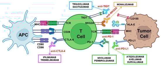 Immune checkpoints are cellular receptors that, interacting with their ligands, function like regulatory “switches” of the immune system. Their primary role is to maintain immune balance by preventing immune cells from attacking healthy tissues, which could lead to autoimmune diseases [105]. These receptors are located on the surface of the main cytotoxic effectors, T lymphocytes, or NK cells (Figure 2). T lymphocyte activation requires the specific antigen recognition of peptides presented on the MHC, accompanied by co-stimulatory signals such as those delivered by CD28 and cytokines. Once activated, they proliferate and perform their effector functions, which must be subsequently stopped to return to homeostasis. Tumor cells can exploit these immune checkpoints to evade immune response by expressing ligands that interact with these inhibitory receptors on immune effectors [106]. These molecules are suitable targets for potentiating tumor immune responses. In the same way, NK cells require a balance between activating and inhibitory signals for their correct functioning. Blocking inhibitory signals, such as those promoted by NKG2A or TIGIT, may favor more effective immune responses (Figure 2).