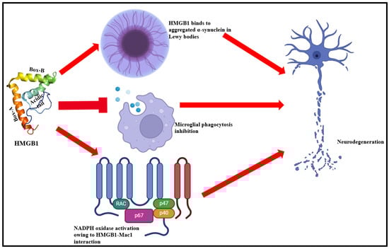 HMGB1 binds to α-synuclein aggregates in Lewy bodies, inhibits microglial phagocytosis, and upregulates NADPH oxidase levels (chiefly via NF-κB signaling) to mediate neurodegeneration [51,53].