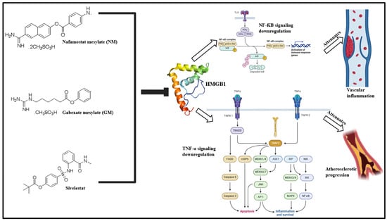 Synthetically derived SMIs, viz., nafamostat mesylate, gabexate mesylate, and silvestat prevent extracellular HMGB1 release, downregulate NF-κB and TNF-α pro-inflammatory signaling, and attenuate vascular inflammation and atherosclerosis progression [51,53,225].