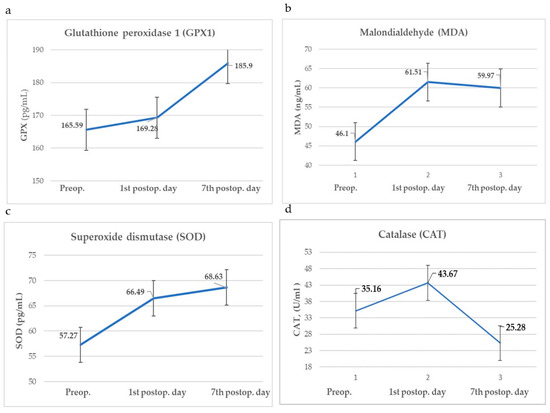 In recent years, there has been an increasing focus on minimizing the negative impacts of surgery and preventing the onset of secondary conditions to enhance patients’ QOL. These efforts aim to alleviate the financial strain on healthcare systems, which often arises from extended hospital stays and additional corrective treatments. Surgical procedures can impose varying physiological stress levels on the body, potentially resulting in postoperative complications [9]. Surgery is a critical event that triggers considerable inflammation and ischemia/reperfusion injury (IRI), leading to increased production of ROS and a decline in antioxidant defense mechanisms, ultimately causing oxidative stress [16]. MDA is a pro-oxidant and frequently used biomarker for assessing oxidative stress and lipid peroxidation [17]. Conversely, antioxidant enzymes such as SOD, GPX1, and CAT play a crucial role in neutralizing free radicals, serving as the primary defense against tissue damage induced by ROS [18].