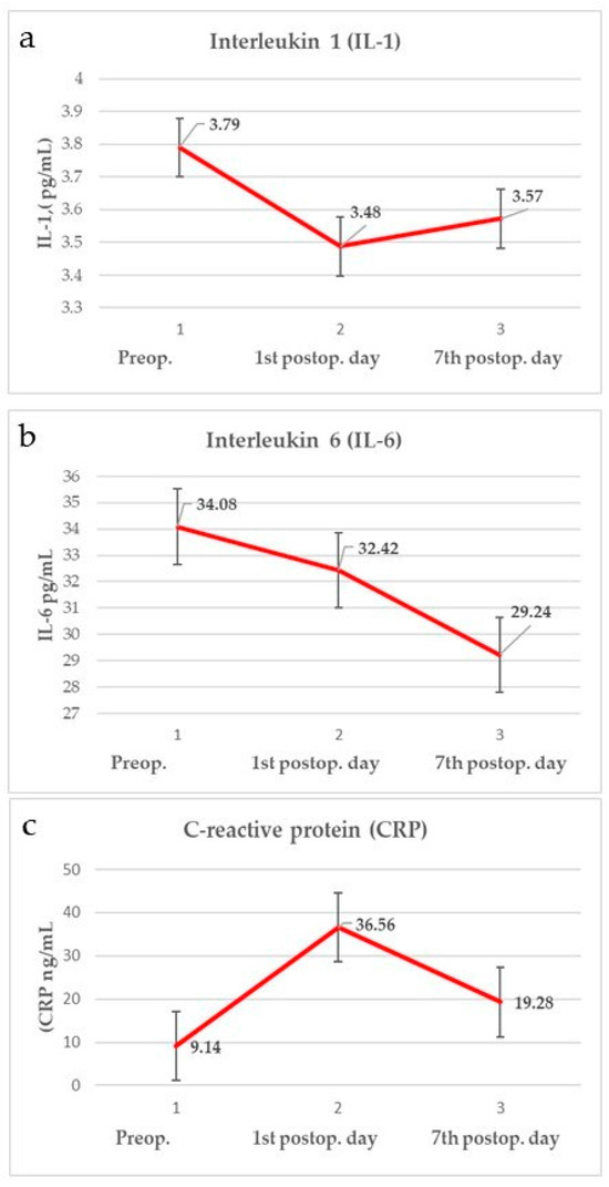 Parameters of inflammation: (a) IL-1, (b) IL-6, (c) CRP.