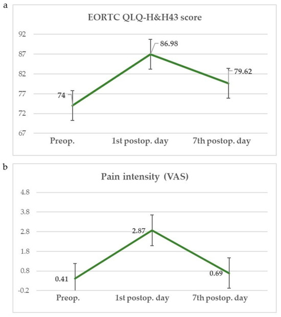 EORTC QLQ—H&N43 score (a) and pain intensity (VAS) (b).