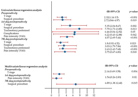 Univariate and multivariate linear regression analysis with the EORTC QLQ—H&N43 score as a dependent variable is shown in Figure 4. In univariate linear regression analysis, preoperatively significant predictors of the EORTC QLQ—H&N43 score were T stage (p < 0.001) and the extent of the surgical procedure (p = 0.019). On the 1st postoperative day, significant predictors of the EORTC QLQ—H&N43 score were T stage, the extent of the surgical procedure, tracheotomy performed before surgery, postoperative complication occurrence, and pain intensity (p < 0.05). On the 7th postoperative day, significant predictors of the EORTC QLQ—H&N43 score were T stage, the extent of the surgical procedure, tracheotomy performed before surgery, and pain intensity (p < 0.05).