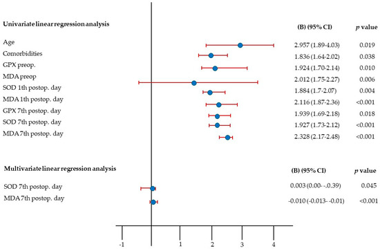 Figure 5 presents the univariate and multivariate linear regression analysis with complication occurrence as the dependent variable. In the univariate analysis, significant predictors of postoperative complications included the age, the presence of comorbidities, and preoperative levels of GPX and MDA, SOD and MDA levels on the 1st postoperative day, and GPX, SOD, and MDA levels on the 7th postoperative day (all p < 0.05).