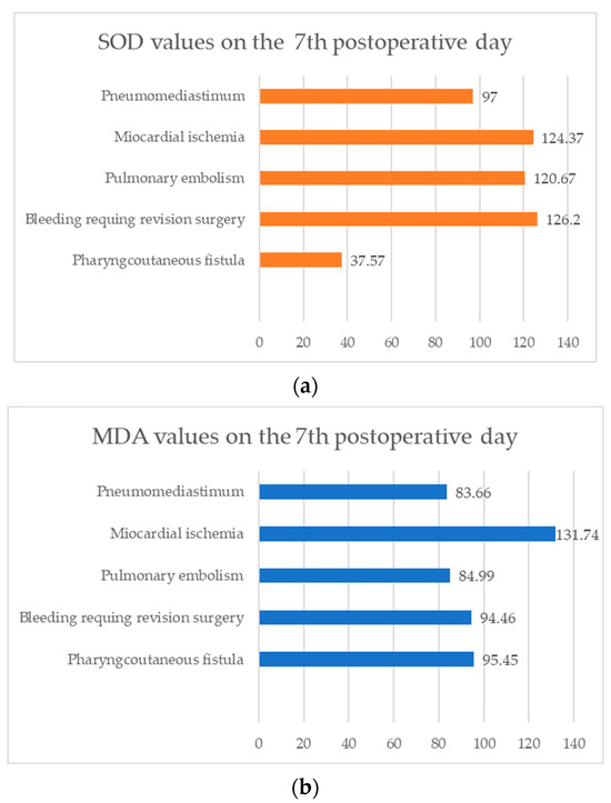 Figure 6a,b show that the SOD and MDA levels on the 7th postoperative day depended on the type of complication. Both parameters were elevated, with variations across different complications. During myocardial ischemia, the levels of both parameters were especially high, followed by other life-threatening complications, such as pulmonary embolism, pneumomediastinum, bleeding requiring revision surgery, and pharyngocutaneous fistula formation. Interestingly, while pharyngocutaneous fistula is considered a challenging surgical complication, it was not accompanied by particularly high levels of either parameter.