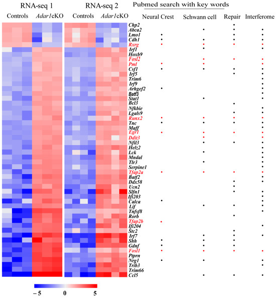 Transcriptional regulator transcripts deregulated in the sciatic nerves of Adar1cKO versus the controls. Transcriptomic analysis identified 52 transcriptional regulators deregulated in the sciatic nerves of HtPA-Cre; Adar1fl/fl (Adar1cKO) mutants relative to the controls with fold change (FC ≥ 5). Heatmap representations of differentially-expressed transcriptional regulators [found in association with the GO terms mentioned in the text and deregulated more than fivefold in Adar1cKO mutants (n = 7) relative to the controls (n = 7) in RNA-Seq 1 and RNA-Seq 2 datasets]. The name of each gene is indicated on the right, with whether it belongs to the Interferome database, or involved in the Schwann cell repair process (see Table S3 for PMIDs). Genes found in the literature using the “neural crest” or “Schwann cells” keywords are also indicated. Colors reflect the z-score. Deregulated transcripts indicated in red (including dots) were the ones selected for further experimental validation.