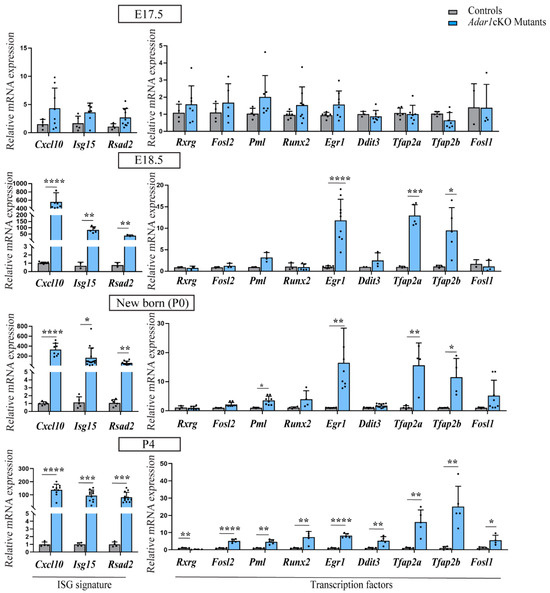 Timing of the expression of candidate transcription factors in the sciatic nerves of Adar1cKO versus the controls. Analysis of the expression of Rxrg, Fosl2, Pml, Runx2, Egr1, Ddit3, Tfap2a, Tfap2b, Fosl1, and Interferon stimulated genes (ISG signature composed of Cxcl10, Isg15, Rsad2) in the sciatic nerves of the controls (grey) and HtPA-Cre; Adar1fl/fl (Adar1cKO) mutants (blue) at embryonic day E17.5 and E18.5, newborn (P0), and post-natal day 4 (P4) by RT-qPCR. All data represent the mean ± SD. Statistical differences between the groups (n = 3 to 12 controls and n = 3 to 11 mutants) were determined using the t-test (asterisks represent p values: * p ≤ 0.05, ** p < 0.01, *** p < 0.001, **** p < 0.0001).