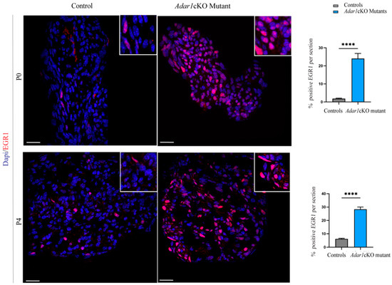 Upregulation of the EGR1 protein in the sciatic nerves of Adar1cKO compared to the controls. EGR1 (red) immunostaining was performed on sections of sciatic nerves of Adar1cKO and the control mice at P0 and P4. Counter staining with DAPI is shown to identify the nuclei. Scale bar: 60 µm. Quantification was performed by counting the percentage of EGR1 positive nuclei over the total number of DAPI positive cells per section of 9 to 12 sections per genotype. Statistical differences between the groups were determined using the t-test (asterisks represent p values: **** p < 0.0001).