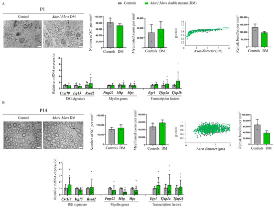 Because most of these double mutants died within the first 15 days of life (Figure S3A), the sciatic nerves of Adar1;Mavs DM were analyzed by electron microscopy (EM) and compared to the controls at P1 (Figure 4A) and at P14 (surviving ones, Figure 4B). At the ultrastructural level, there was no observable difference between Adar1;Mavs DM and the other genotypes (referred to as controls) at both stages analyzed. Quantification confirmed these observations, showing an unaltered number of Schwann cells per square millimeter in Adar1;Mavs DM relative to the controls. Myelinated axons per square millimeter, the g-ratio (defined as the ratio of the inner axonal diameter to the total outer fiber diameter) and the number of Remak bundles per square millimeter were also not significantly different (Figure 4A,B). Of note, a general observation of these double mutants additionally revealed normal pigmentation (Figure S3B).