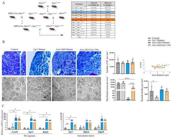 The dissected sciatic nerves of animals of each genotype were also used to perform RT-qPCR to analyze the expression of (i) Cxcl10, Isg15, and Rsad2; and (ii) Egr1, Tfap2a and Tfap2b (Figure 5C). All of the Adar1cKO;Egr1Het mutants retained high levels of the expression of ISGs (similarly to Adar1cKO). As expected, the level of Egr1 was drastically decreased in the Egr1 mutants. It was also reduced in the Adar1cKO;Egr1Het mutants compared to Adar1cKO, but higher than in the controls. Although not significant, the expression of Tfap2a and Tfap2b was similarly upregulated in Adar1cKO;Egr1Het and Adar1cKO compared to the controls and Egr1 single mutants. Altogether, these results suggest that the deletion of one copy of Egr1 partially rescues the myelination process in Adar1cKO mutants. This partial rescue occurs despite ISG, Tfap2a, and Tfap2b expression remaining abnormally high in the Adar1cKO;Egr1Het mutants relative to the controls.