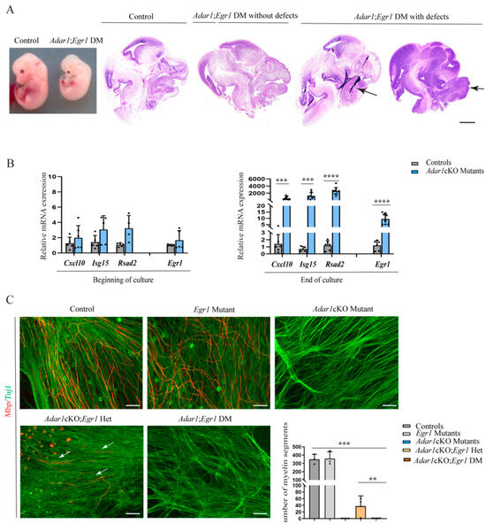 Because myelination capacity can be assessed in vitro using mixed sensory neuron-Schwann cell co-culture starting from the dorsal root ganglia (DRG) from embryos at day E13.5, we collected eight litters of embryos at this stage. A total of 130 embryos were thus dissected, 15 of which were Adar1cKO;Egr1 DM, suggesting that these embryos were present at the expected Mendelian ratio (percentage observed: 11.5%, expected: 6.25%). Of note, five of the Adar1cKO;Egr1 DM embryos analyzed showed craniofacial alterations also found in pathologies related to neural crest defects such as mandibular hypoplasia, maxillomandibular fusion (syngnatia), and macroglossia (tongue abnormalities) (Figure 6A) [47,48,49].