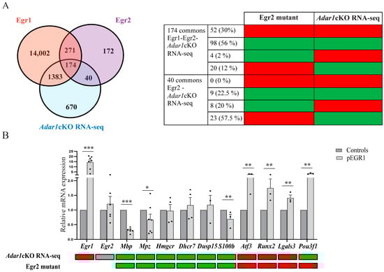 Overexpression of EGR1 disturbs the expression of several EGR2 regulated genes. (A) Venn diagram showing the overlap between genes misregulated in the RNA-Seq data generated in this study (Adar1cKO RNA-Seq), in EGR2-ChIP-Seq data on sciatic nerves [52], and in EGR1-ChIP-Seq performed in various cell lines [55]. The number of genes overlapping between each dataset are indicated. Table on the right indicates the number and % of genes upregulated (red) or downregulated (green) in the Egr2 hypomorphic mutants or in Adar1cKO mutants among the 174 genes and 40 genes overlapping between EGR1/EGR2 ChIP-Seq/Adar1cKO RNA-Seq or EGR2/Adar1cKO datasets, respectively. (B) RT-qPCR validation of 10 of the overlapping and differentially-regulated genes on RNA extracted from mouse Schwann cells non-transfected or transfected with the EGR1 overexpression plasmid. Relative expression levels in non-transfected (grey) and transfected (light grey) are presented as the mean ± SEM Statistical differences between the groups (n = 3 to 7) were determined using the t-test (asterisks represent p values: * p ≤ 0.05, ** p < 0.01, *** p < 0.001. For comparison, up (red) and down (green) expression of selected transcripts in the Adar1cKO RNA-Seq and EGR2 mutant datasets are presented below.