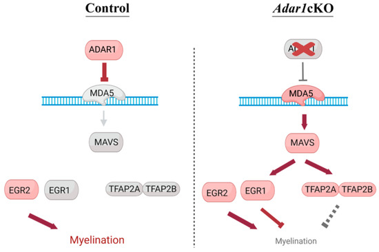 Model summarizing the proposed effect of Adar1 deletion, leading to increased expression of the transcription factor. In normal Schwann cells, ADAR1 edits dsRNAs, preventing their recognition by the MDA5 sensor. Upon NC-specific Adar1 deletion, activation of the MDA5/MAVS pathway leads to aberrant overexpression/re-expression of Egr1, Tfap2a, and Tfap2b, which are repressors of the myelination process; EGR1 competes with EGR2 to control the myelination process. Red: activated and grey: not activated.