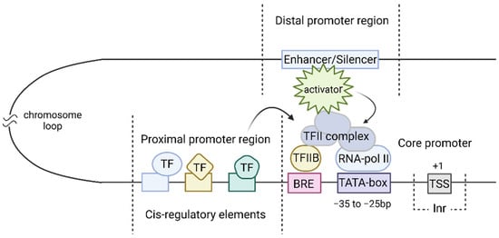 The presence of the core promoter is a sufficient condition for the initiation of transcription [61], but ensures its low basal level [52]. The level of transcription depends on many factors, including chromatin packing density and the location of additional regulatory elements [62]. Some of these elements are close to the core promoter and form the proximal promoter region, while others are located a few kb away and form the distal promoter region.