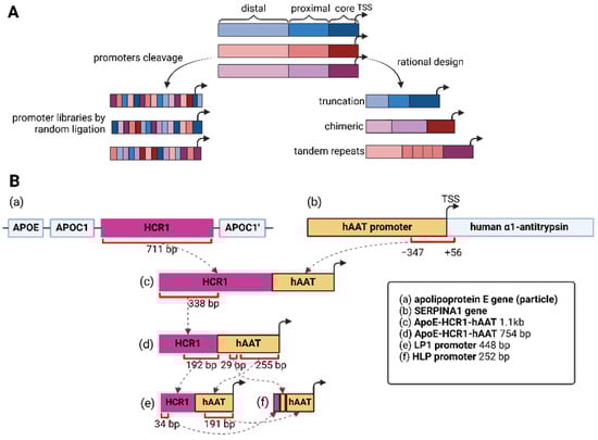 Synthetic promoter design. (A) Synthetic promoters’ manual design approaches. Design approaches can be divided into rational design methods (truncation, chimeric/hybrid promoters, tandem repeats of cis-regulating elements) and creation of promoter libraries by cleavage and random ligation. (B) Creation of a synthetic promoter on the example of HLP. A 711 bp sequence was taken from the HCR1 enhancer region of the apolipoprotein E gene (a) and fused to the hAAT promoter region (−347 to +56) of the SERPINA1 gene (b), which resulted in the first ApoE-HCR1-hAAT 1.1 kb promoter (c) [105]. The ApoE-HCR1-hAAT promoter was further shortened to 754 bp (d) by deleting the last 373 nucleotides from the HCR1 enhancer (338 bp of HCR1 remaining) [106]. The 448 bp LP1 (e) promoter was derived from the 192 bp region of the HCR1 enhancer and the 255 bp region of the hAAT promoter [107]. The final HLP (f) promoter in these series was obtained by adding a 29 bp region from the ApoE-HCR1-hAAT 754 bp promoter to the 191 bp region of the hAAT and 34 bp region of the HCR1 enhancer of the LP1 promoter [108]. The shaded arrows represent the strategies division for creating promoters while the dashed lines indicate the succession of promoter regions.